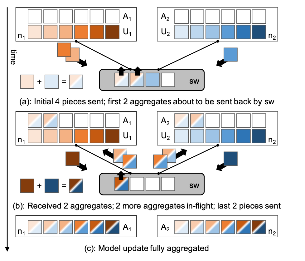 Distributed machine learning training workloads now find that the network can be a bottleneck, as a result of both increasing scale and single-node performance. We accelerate distributed parallel training by designing a communication primitive that uses a programmable switch dataplane to execute a key step of the training process. SwitchML reduces the volume of exchanged data by aggregating the model updates from multiple workers in the network.